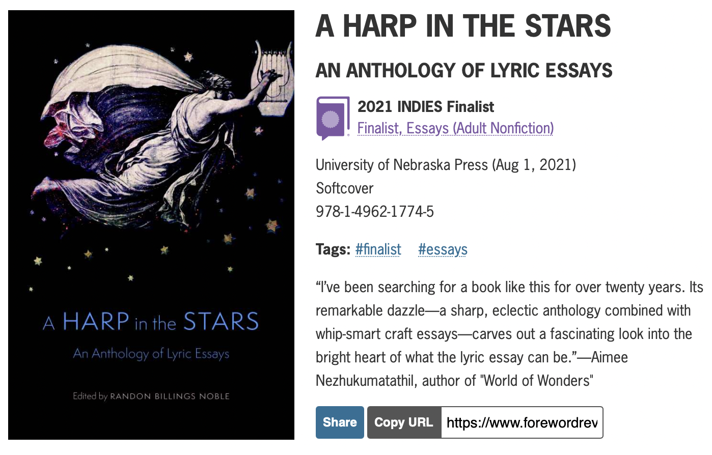 A Harp in the Stars: An Anthology of Lyric Essays was published by the University of Nebraska Press in October 2021. You can purchase it wherever books are sold, including here: